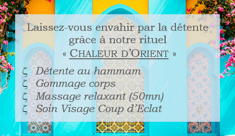 Associant Soins du Corps et Soin du Visage, découvrez nos Rituels "Chaleur d'Orient", " Rituel Impérial Japonais", "Rituel de l'Inde" et "Rituel Corps Absolu" et évadez vous pour 2h30 de détente et relaxation...